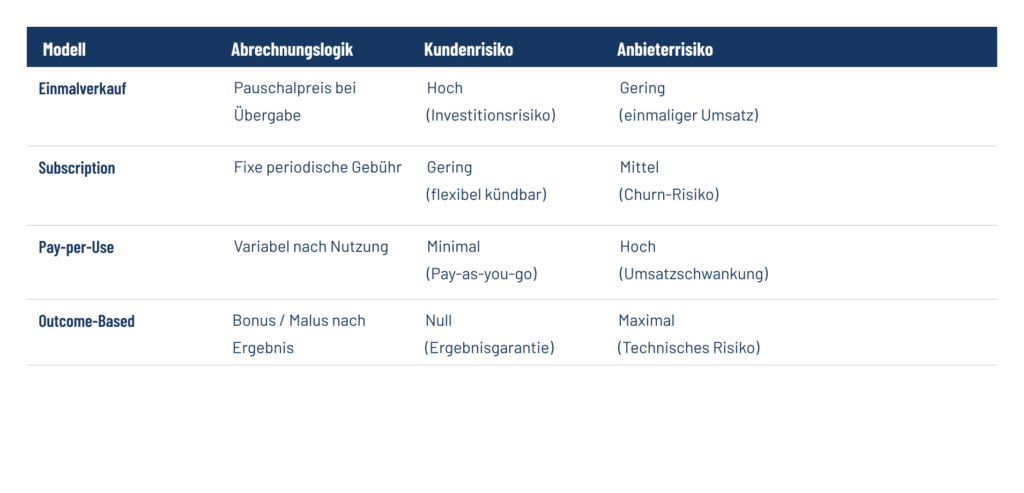 Je stärker sich ein Unternehmen von einmaligen Produktverkäufen hin zu Subscriptions, Pay-per-Use- oder Outcome-Modellen entwickelt, desto stärker verschiebt sich das wirtschaftliche Risiko vom Kunden zum Anbieter.