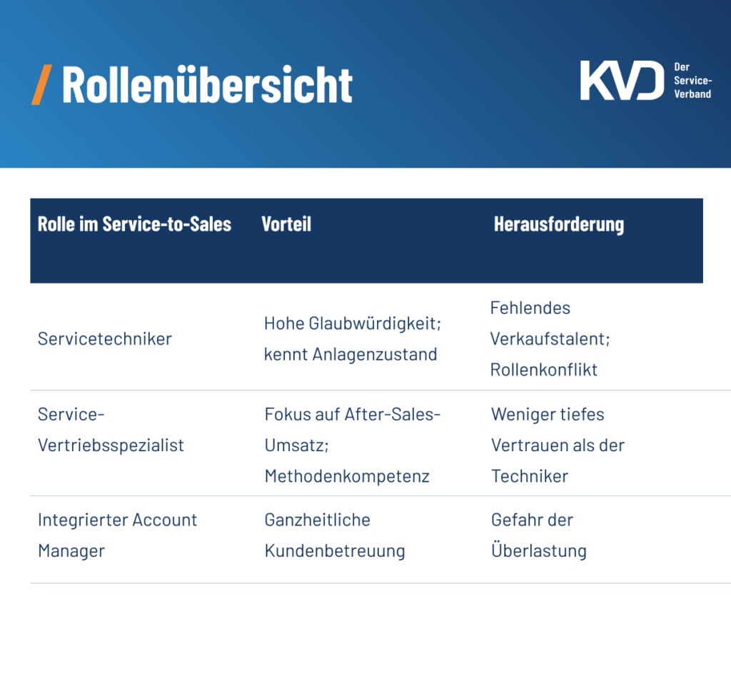 Besonders intensiv wird damit auch die Frage behandelt, ob der Service selbst vertriebliche Aufgaben übernehmen kann oder muss. Das Konzept „Service-to-Sales“ nutzt die Tatsache, dass Servicetechniker beim Kunden oft ein deutlich höheres Vertrauensniveau genießen als klassische Verkäufer. Der Techniker wird als neutraler Experte wahrgenommen, der zur Problemlösung kommt, während der Verkäufer oft unter dem Generalverdacht steht, primär seinen Umsatz steigern zu wollen.